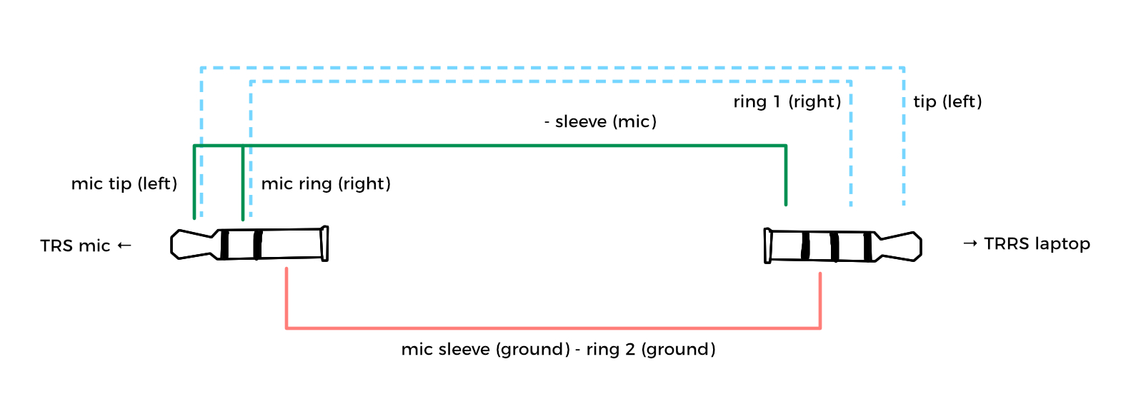 What we need in this case is to wire both audio channels from the microphoen to the mic channel on the TRRS side, as shwon in the diagram above. While some “TRS to TRRS” cables on the market simply wire the tip and ring 1 of both sides (the blue wiring in the diagram), which works only for audio outputs (speakers and headphones, etc.).